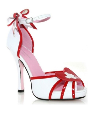Jackie Nurse Adult Shoes includes white peep toe shoes with 4 inch heels, red borders attached heart with cross and ankle strap with red bow. These sexy Nurse Shoes are available in adult sizes 6, 7, 8, 9, and 10.This product is made of Patent Polyurethane. Care Instructions: Spot Clean