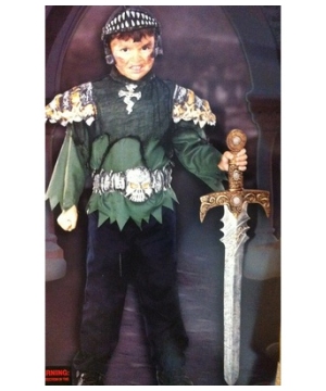 Knight Warrior Costume - Kids Costume includes a hunter green long sleeved jagged edged shirt with shoulder pads, helmet accented with sharp teeth, black pants, and skull belt. This Knight Costume is available in Kids sizes 5-7 and 8-10.Please note that shield, toy sword and shoes are not included.