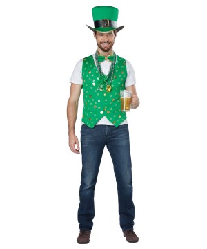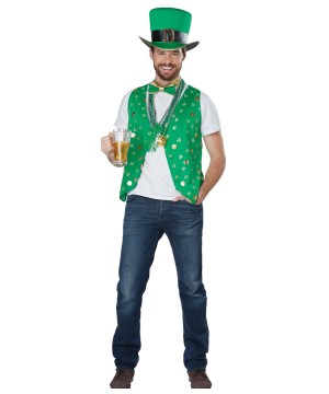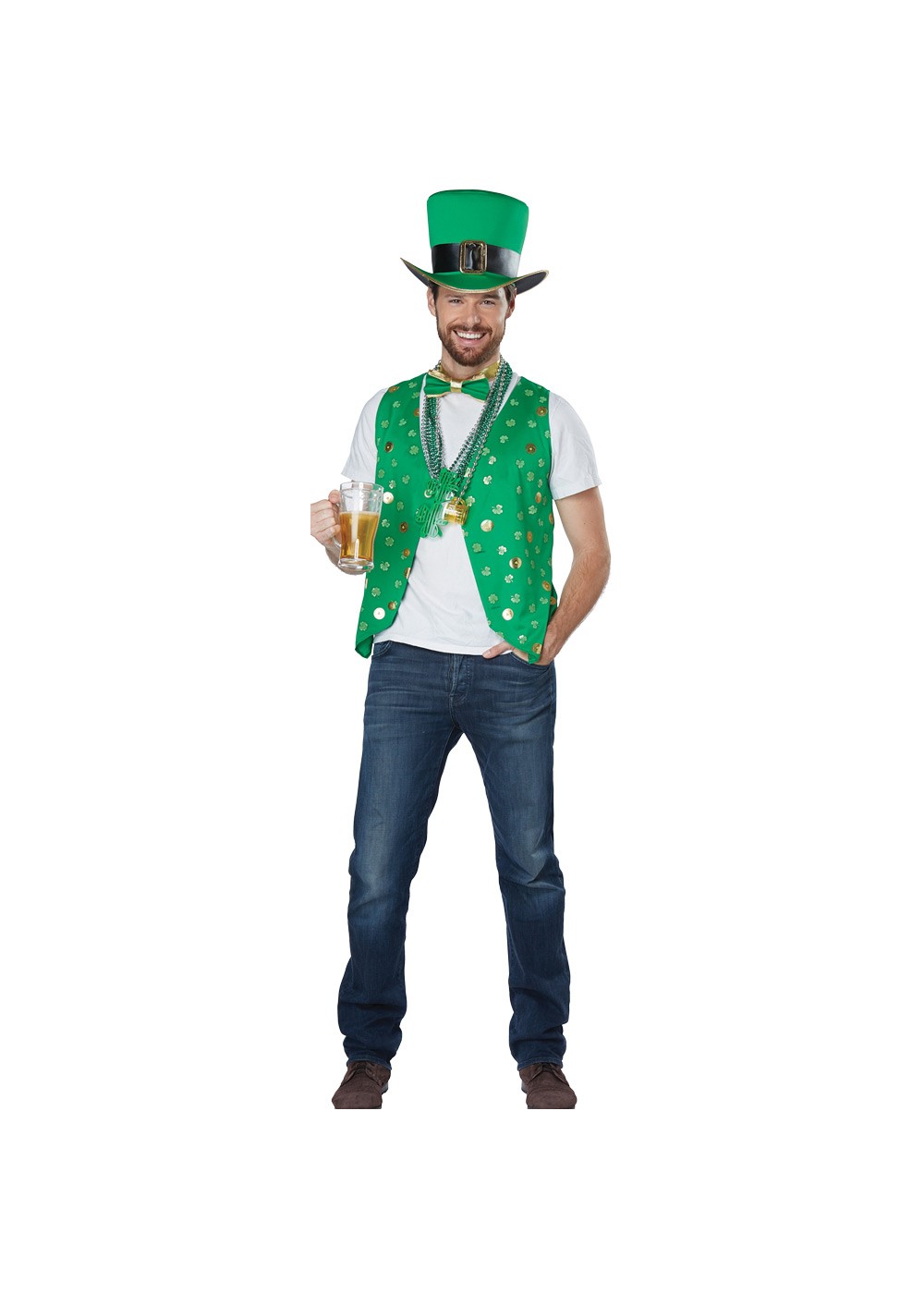 Luck of the Irish Accessory Kit. Includes three button vest with clover and gold coin print, green and gold bow tie and oversized hat with black band. Available in Mens size Large/XLarge.