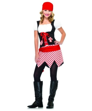 Although she may look cute and sweet, this lass is still a Pirate at heart! Cute Pirate Lass Teen Costume includes Pirate dress with black corset top and striped skirt and attached red waist sash, and head scarf. Please note that stockings and boots are not included. This Pirate Costume for girls is available in teen sizes Small/Medium (10-12) and Medium/Large (12-14).This costume is made of Polyester. Care Instructions: Hand Wash