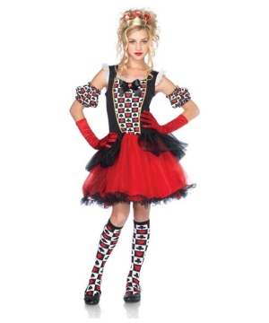 Playing Card Queen Teen Costume is a black, white and red dress with checkerboard printed center front with gold trim, a white pleated standing collar and a red and black layered tulle tutu skirt. Costume also includes a matching golden crown headband with hearts and printed shoulder puff sleeves. This pretty Alice in Wonderland Costume for teens is available in Teen size Medium/Large (12-14) .Please note stockings, petticoat, shoes or gloves are not included.