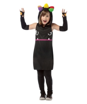 So So Happy Mad Dog Kids Costume includes a black hooded dress featuring printed character face graphic on the front and printed tail graphic on the back, attached hoodie with soft spikes and a pair of fingerless black gloves. This is an official licensed So So Happy (TM) product. This cute Monster Costume for girls is available in child size Medium (7-10).Please note are not included tights or shoes.