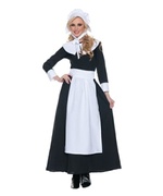 Traditional Pilgrim Girls Costume includes a gown, a cap, and an apron. The charcoal grey floor-length dress has long sleeves and a high neckline. White cuffs and a white neck tie accent are its simple yet sophisticated decorations. The included white bonnet style cap and waist apron help whisk her away to the Colonial days of History-s past, making this Pilgrim Costume an excellent choice not only for Halloween but also for Thanksgiving and School presentations of projects.