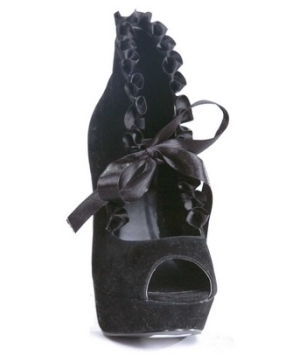 Velvet Peep Toe Adult Shoes includes one pair of beautiful black velvet booties with a great heel ruffled top with a tied ribbon and opening on the toe area for a peep toe. This Costume Accessory is available in women whole sizes 6, 7, 8, 9 and 10.Brand: Ellie Shoes