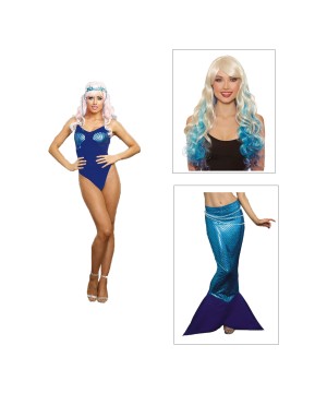 Products include bodysuit with seashell print design, mermaid tail skirt, and blonde wig with blue and purple streaks. Available in sizes small/medium and medium/large.